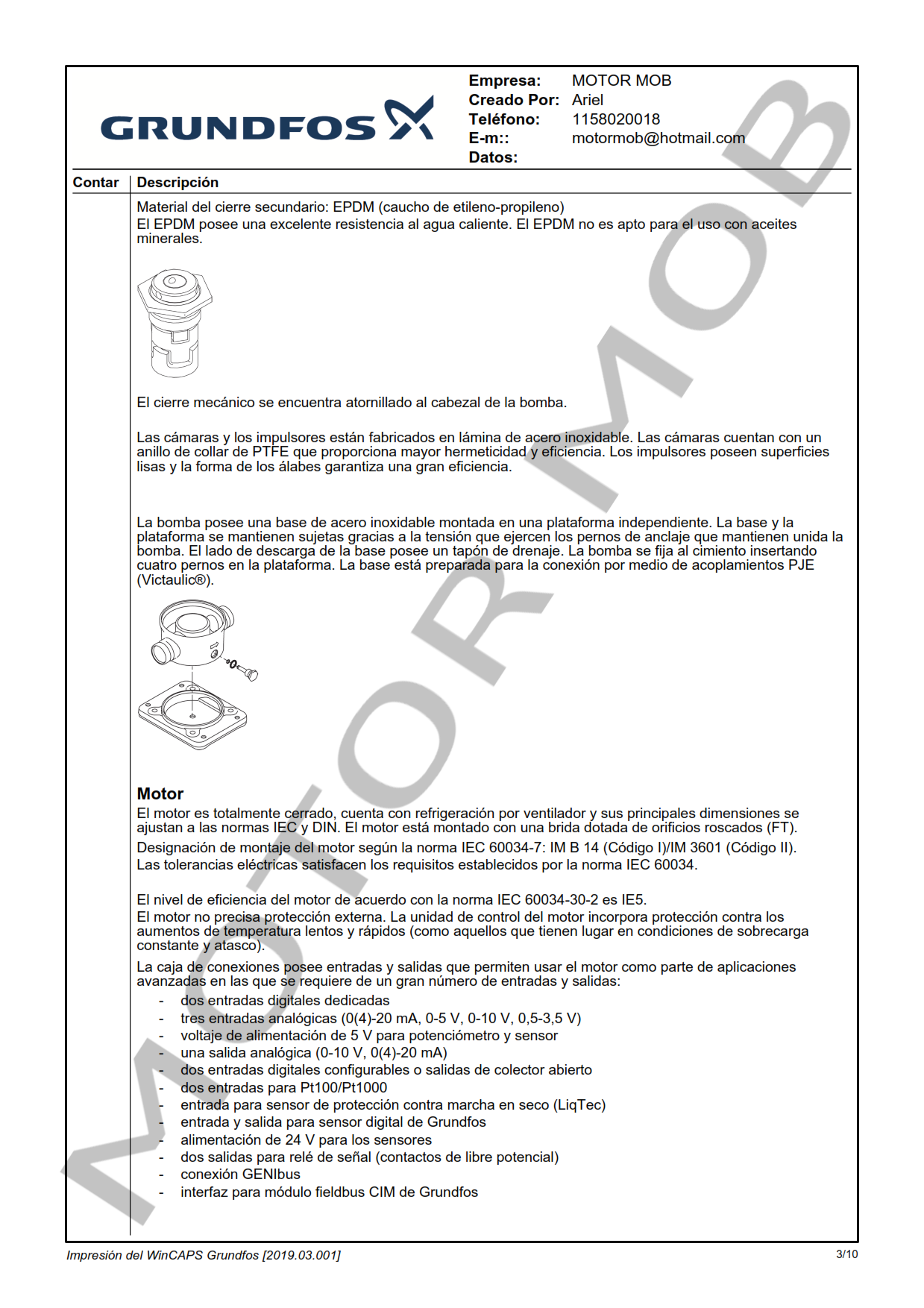 La bomba está equipada con un motor asíncrono de 3 fases, refrigerado por ventilador y montado sobre soportes. El motor incluye un convertidor de frecuencia y un controlador PI en la caja de conexiones. Ello facilita el control variable y continuo de la velocidad del motor, lo cual, a su vez, permite adaptar el rendimiento a un determinado conjunto de requisitos. Un panel de control situado en la caja de conexiones del motor facilita el establecimiento del punto de ajuste necesario, así como la configuración de la bomba en los modos “Mín.”, “Máx.” o “Parada”. El panel de control posee indicadores luminosos vinculados a los estados “En funcionamiento” y “Avería”. La comunicación con la bomba es posible por medio del accesorio de control remoto Grundfos GO Remote. El accesorio de control remoto, además, facilita el ajuste y la lectura de parámetros como el “Valor actual”, la “Velocidad”, la “Potencia de entrada” y el “Consumo energético” total. La caja de conexiones contiene terminales que facilitan el establecimiento de las siguientes conexiones: