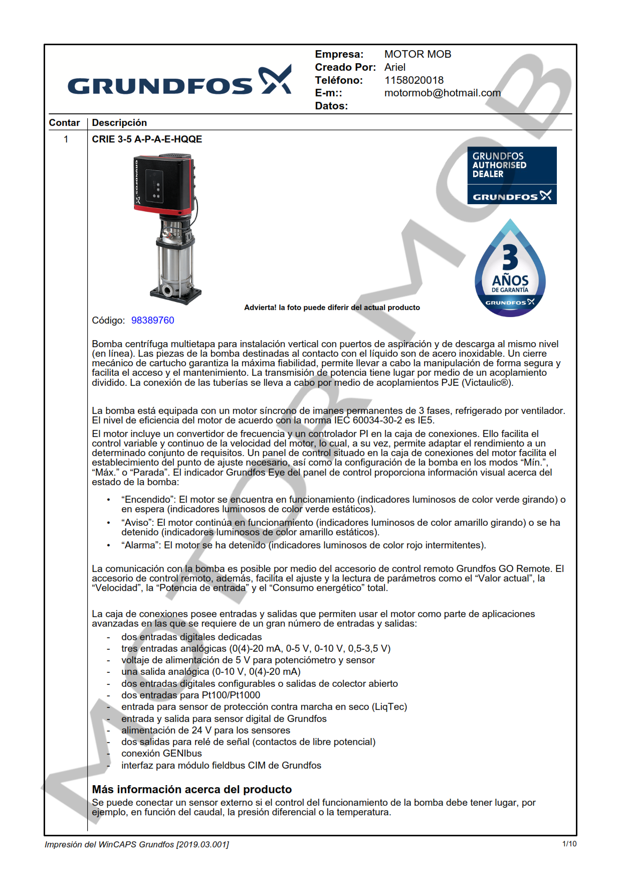 BOMBA MULTICELULAR VERTICAL CON VARIADOR DE VELOCIDAD INCORPORADO – GRUNDFOS – CRIE 3-5 A-P-I-E-HQQE – 1 HP – TRIFASICA – ARTICULO 98389760