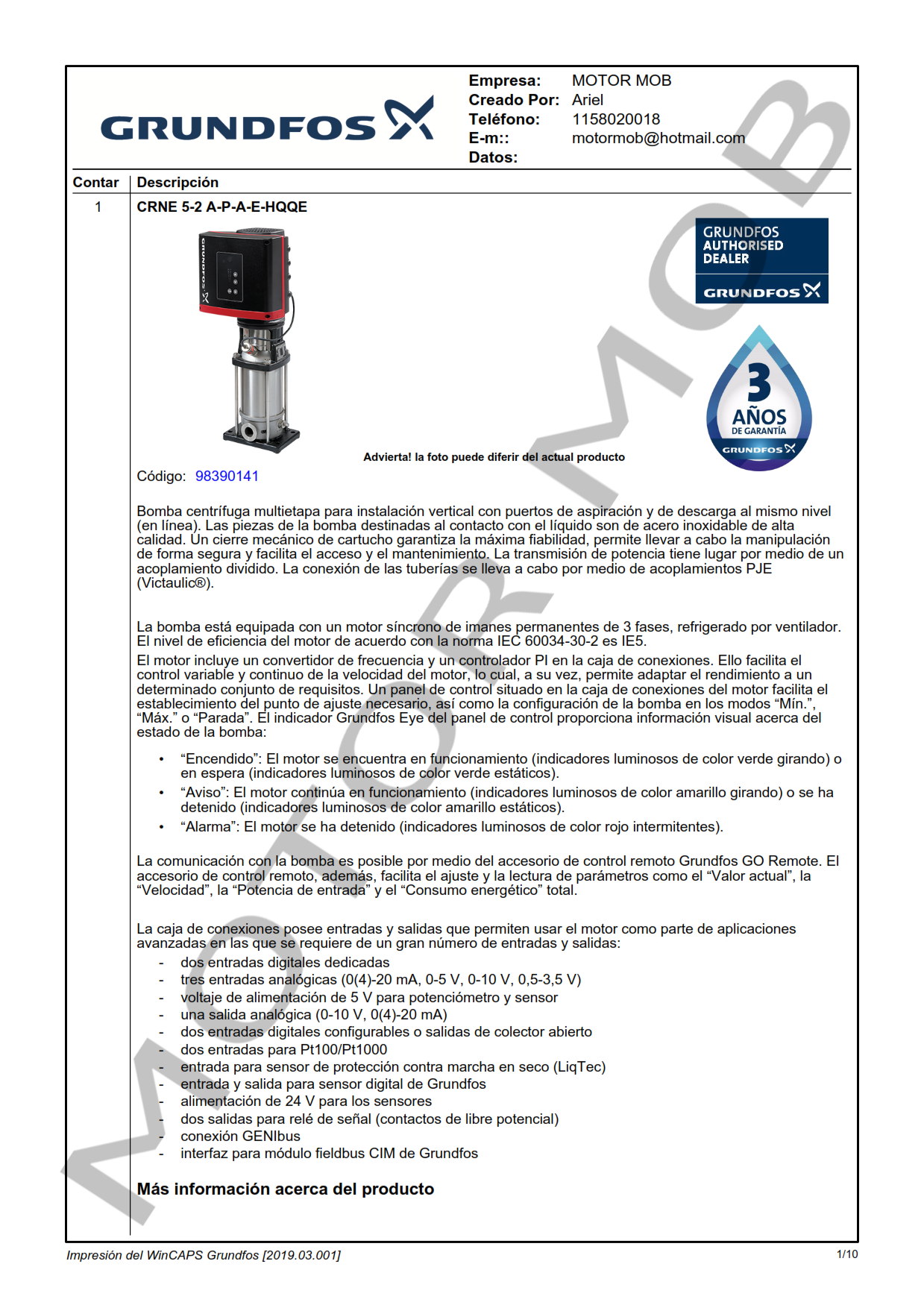 BOMBA MULTICELULAR VERTICAL CON VARIADOR DE VELOCIDAD INCORPORADO – GRUNDFOS – CRNE 5-2 A-P-G-E-HQQE – 0.75 HP – TRIFASICA – ARTICULO 98390141