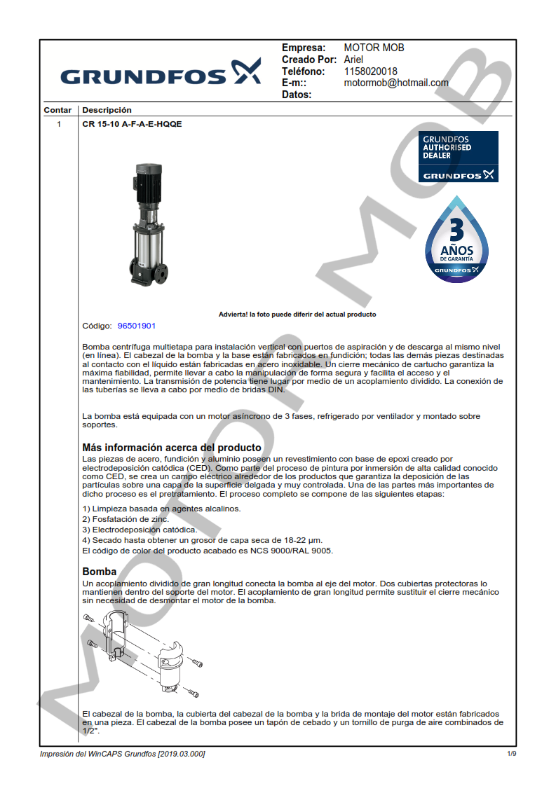 BOMBA MULTICELULAR VERTICAL – GRUNDFOS – CR 15-10 – 15 HP – TRIFASICA – ARTICULO 96501901