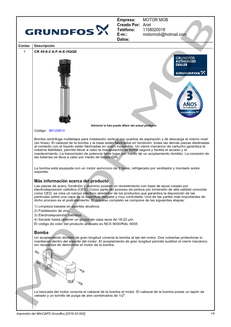 BOMBA MULTICELULAR VERTICAL – GRUNDFOS – CR 45-8-2 – 40 HP – TRIFASICA – ARTICULO 96122810