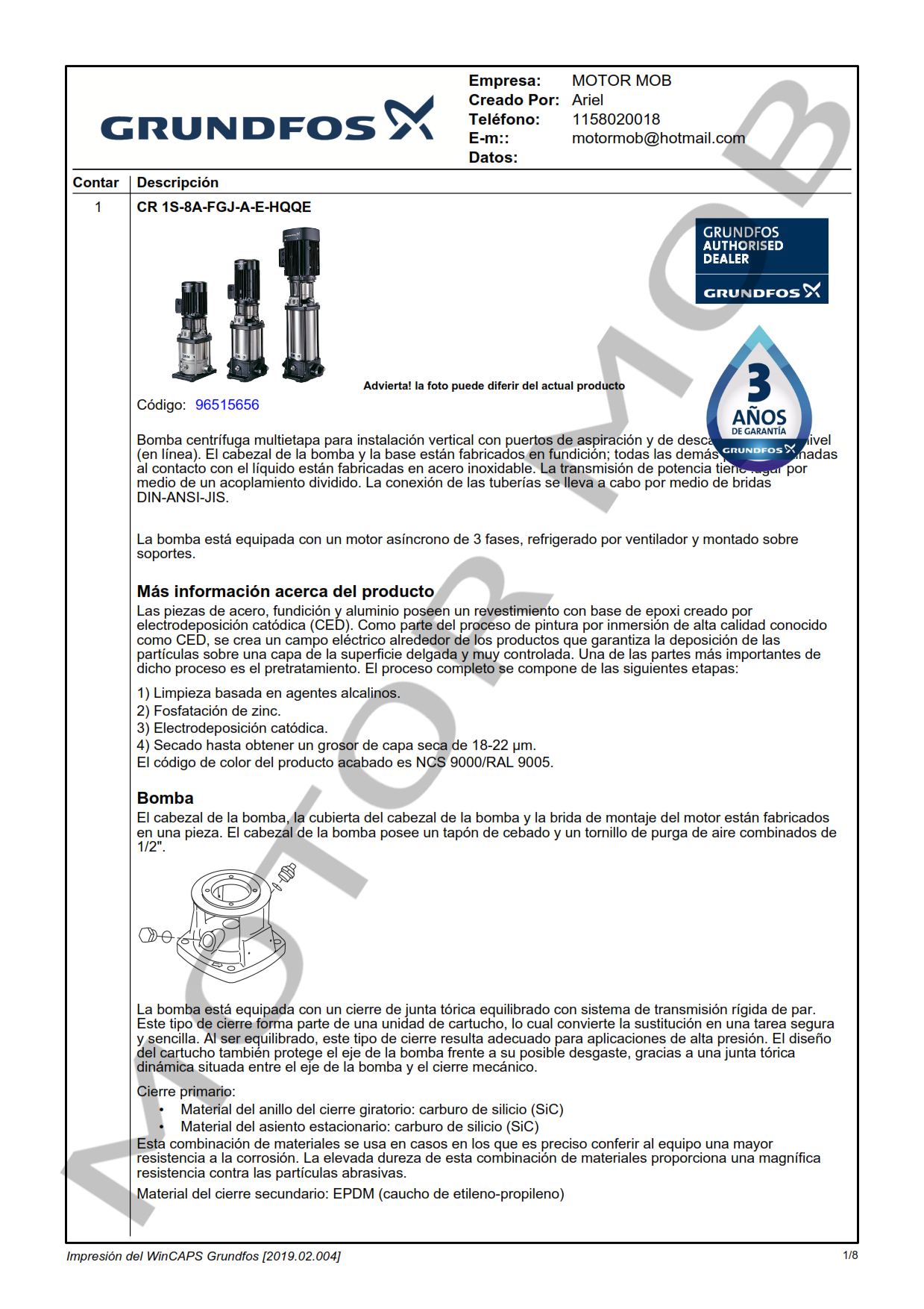 BOMBA MULTICELULAR VERTICAL – GRUNDFOS – CR 1S-8 – 0.5 HP – TRIFASICA – ARTICULO 96515656