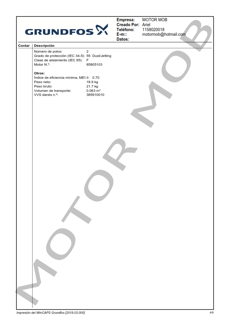 La bomba está equipada con un motor asíncrono de 3 fases, refrigerado por ventilador y montado sobre soportes.