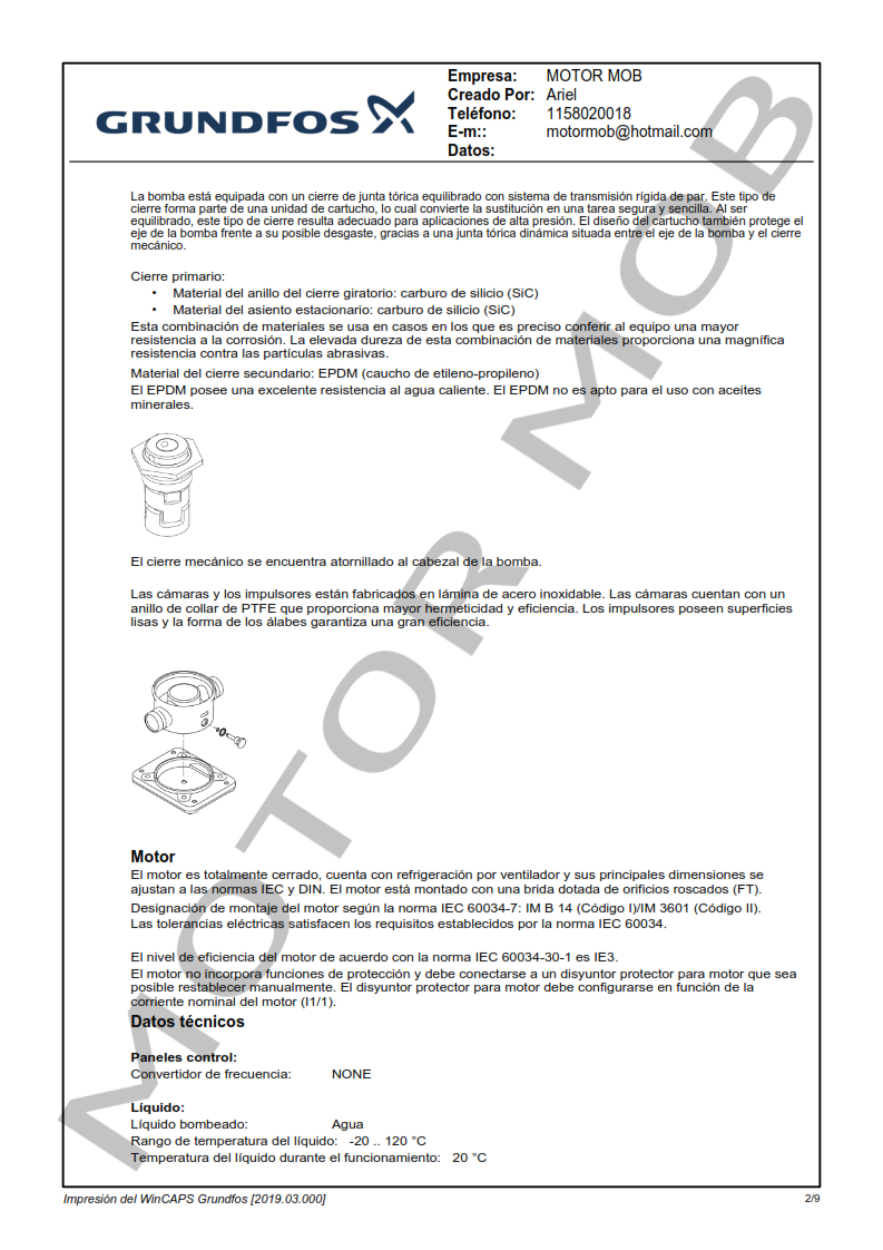 La bomba está equipada con un motor asíncrono de 3 fases, refrigerado por ventilador y montado sobre soportes.