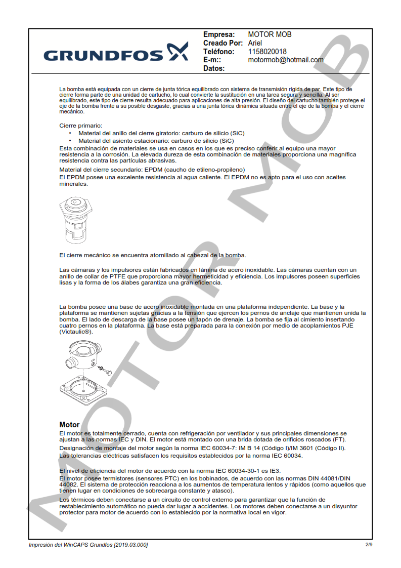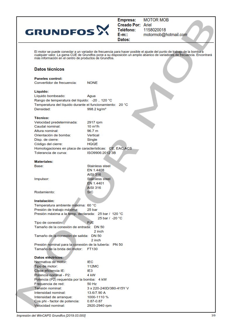 La bomba está equipada con un motor asíncrono de 3 fases, refrigerado por ventilador y montado sobre soportes.