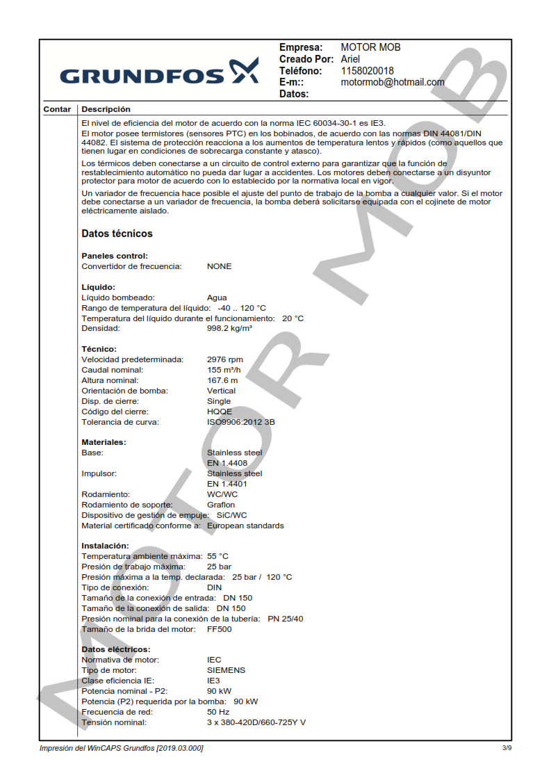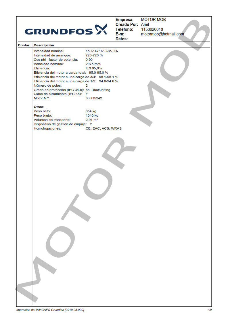 La bomba está equipada con un motor asíncrono de 3 fases, refrigerado por ventilador y montado sobre soportes.