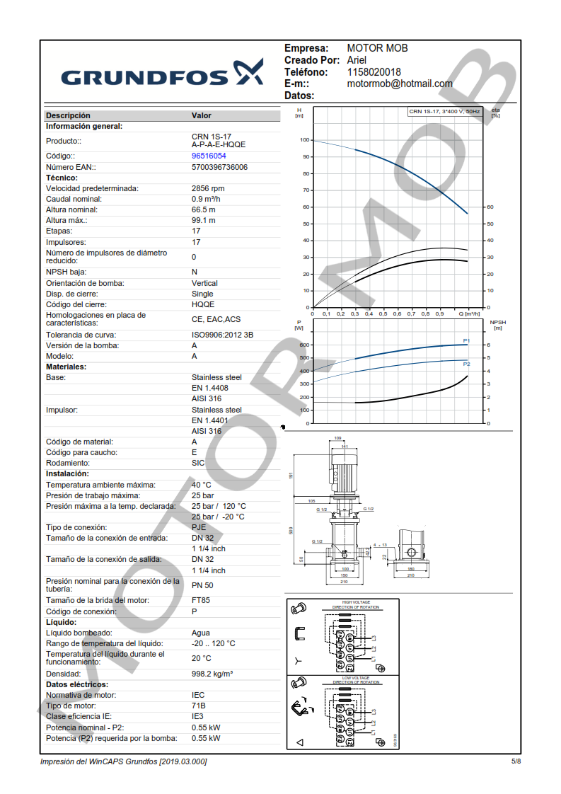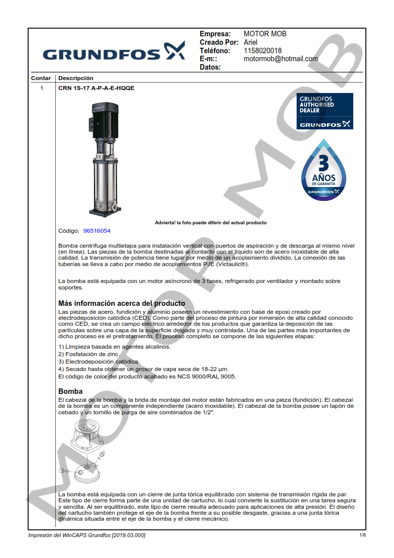 BOMBA MULTICELULAR VERTICAL – GRUNDFOS – CRN 1S-17 – 0.75 HP – TRIFASICA – ARTICULO 96516054
