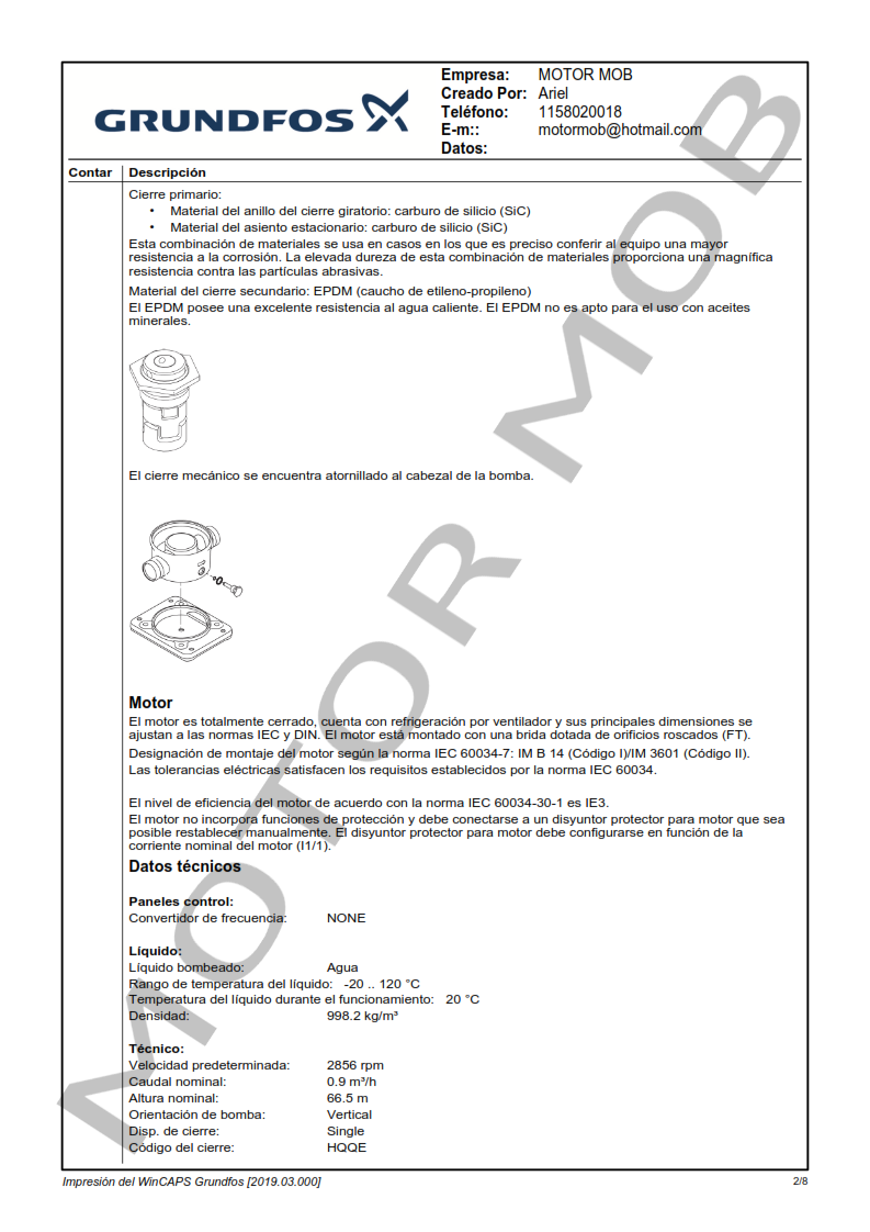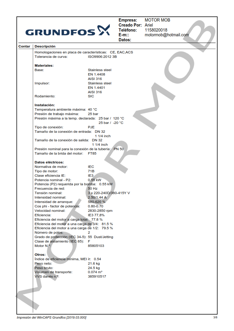 La bomba está equipada con un motor asíncrono de 3 fases, refrigerado por ventilador y montado sobre soportes.