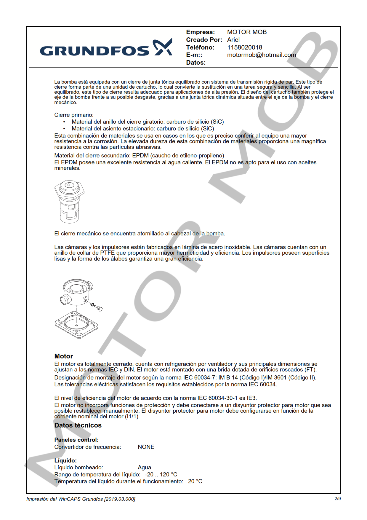 La bomba está equipada con un motor asíncrono de 3 fases, refrigerado por ventilador y montado sobre soportes.