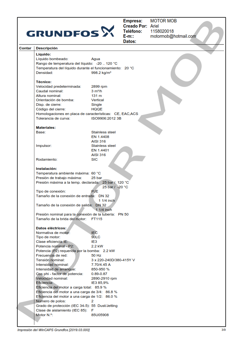 La bomba está equipada con un motor asíncrono de 3 fases, refrigerado por ventilador y montado sobre soportes.