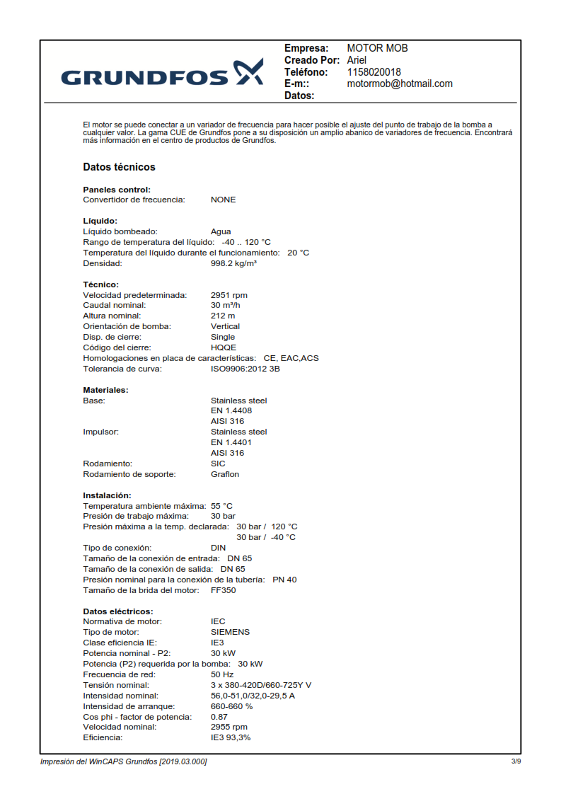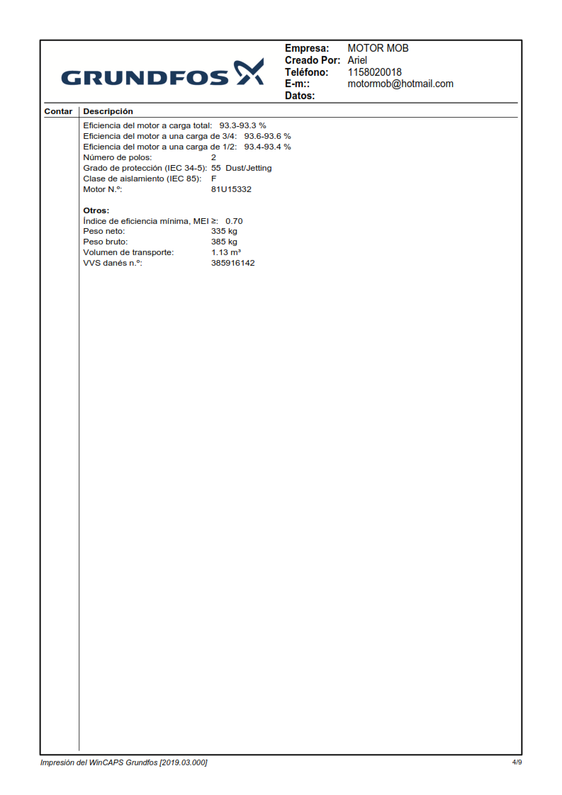 La bomba está equipada con un motor asíncrono de 3 fases, refrigerado por ventilador y montado sobre soportes.