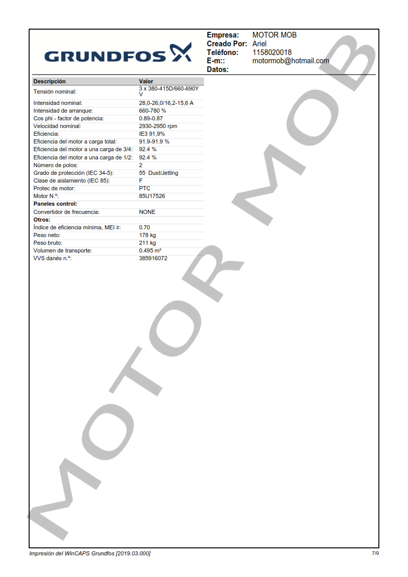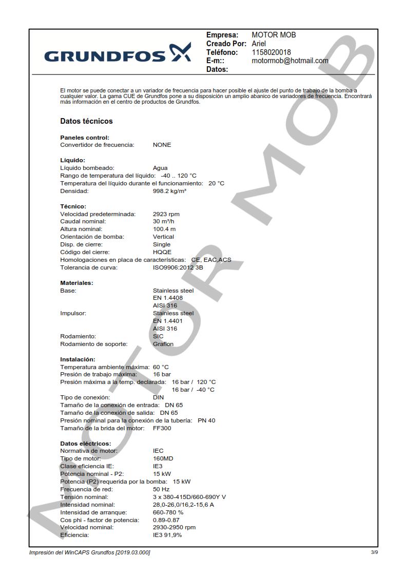 La bomba está equipada con un motor asíncrono de 3 fases, refrigerado por ventilador y montado sobre soportes.