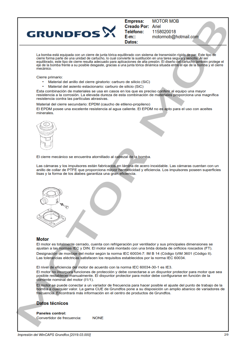 La bomba está equipada con un motor asíncrono de 3 fases, refrigerado por ventilador y montado sobre soportes.