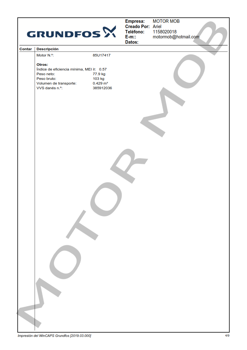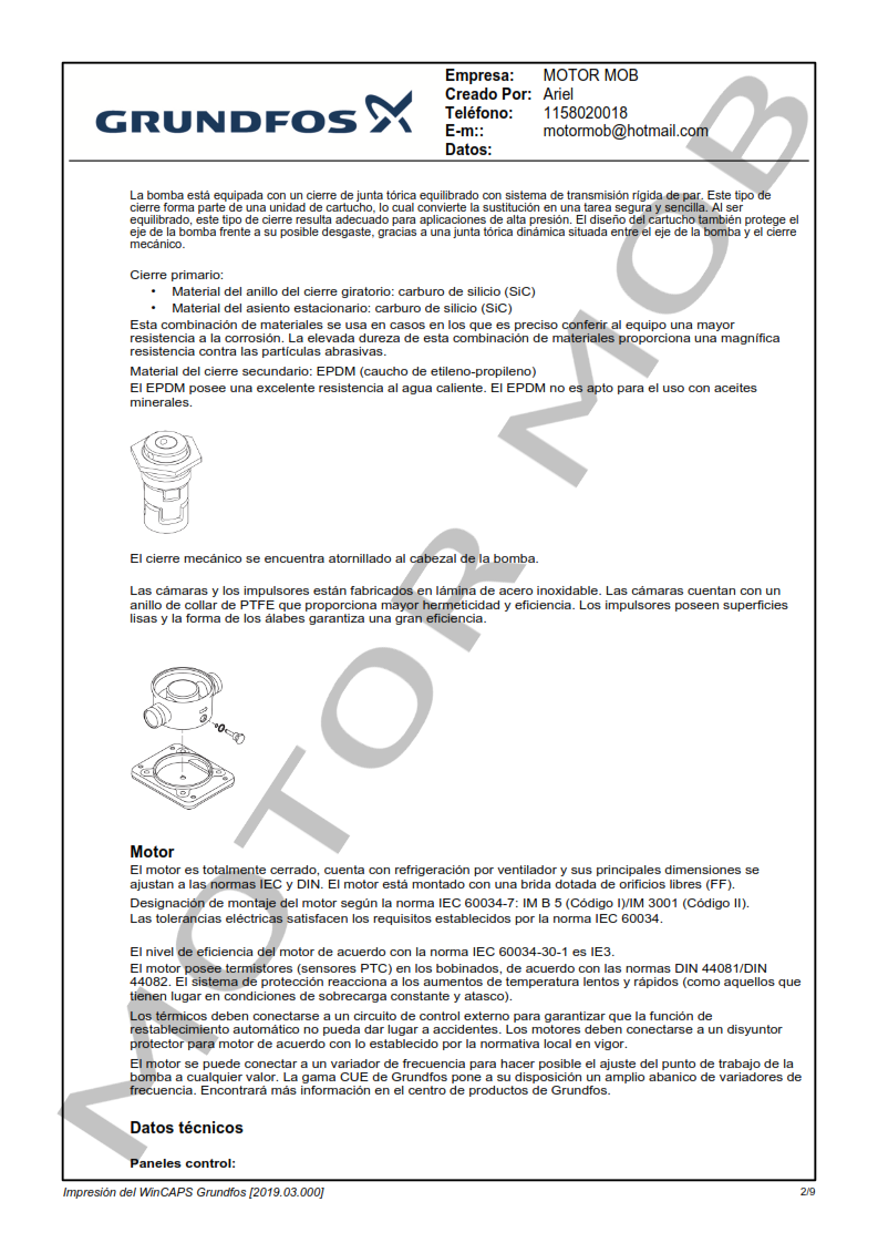 La bomba está equipada con un motor asíncrono de 3 fases, refrigerado por ventilador y montado sobre soportes.