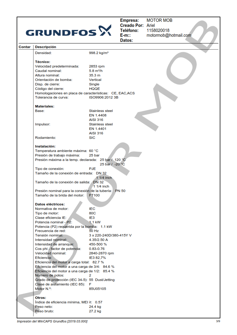 La bomba está equipada con un motor asíncrono de 3 fases, refrigerado por ventilador y montado sobre soportes.