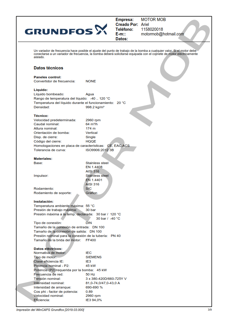La bomba está equipada con un motor asíncrono de 3 fases, refrigerado por ventilador y montado sobre soportes.
