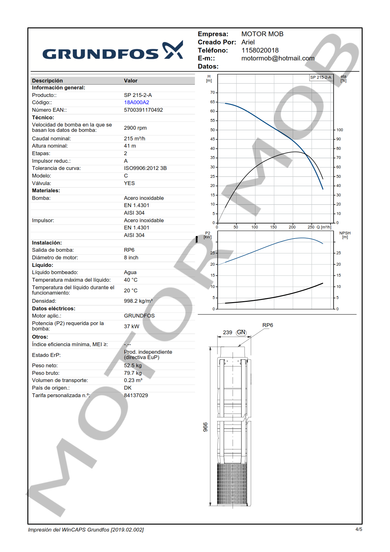 BOMBA SUMERGIBLE PARA POZO DE 10″ – GRUNDFOS – SP 215-2-A – 50 HP – ARTICULO 18A000A2