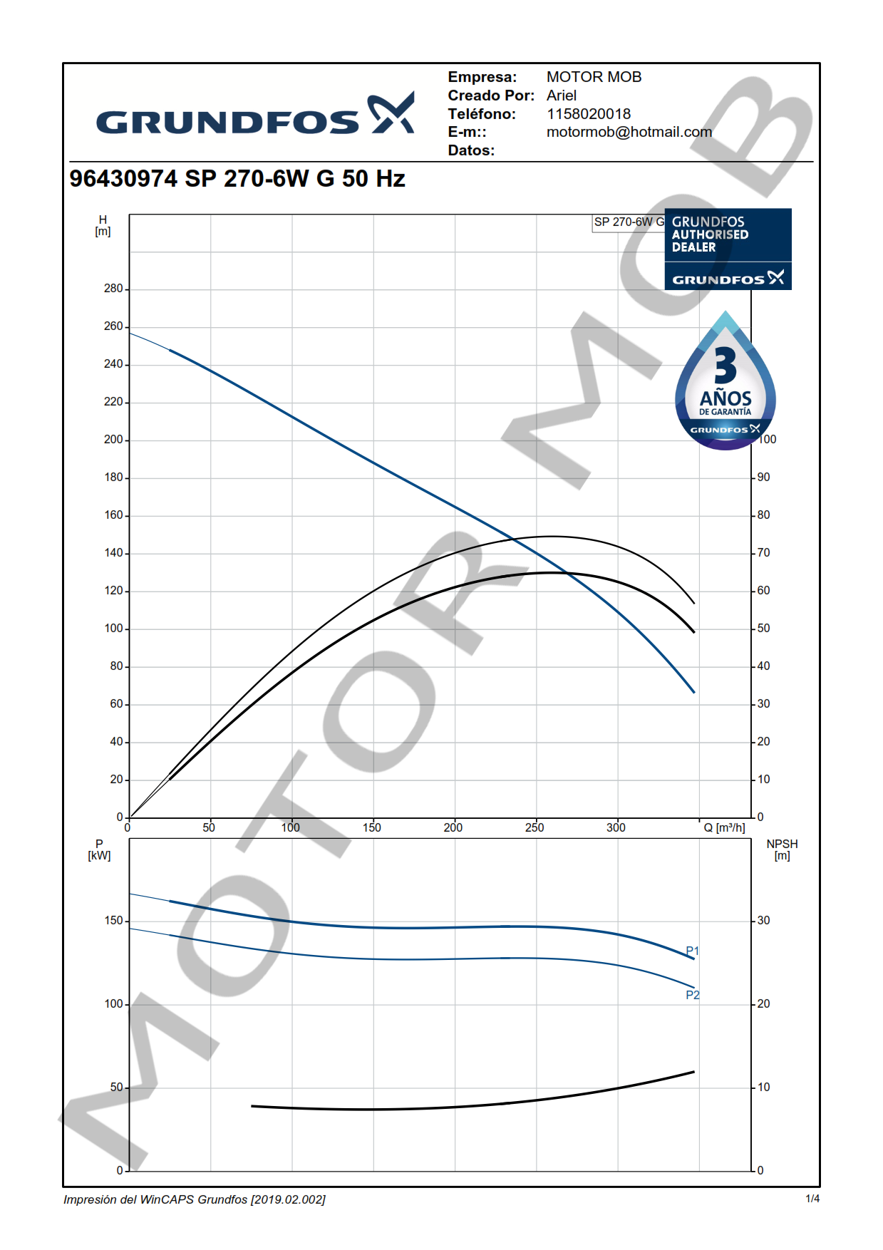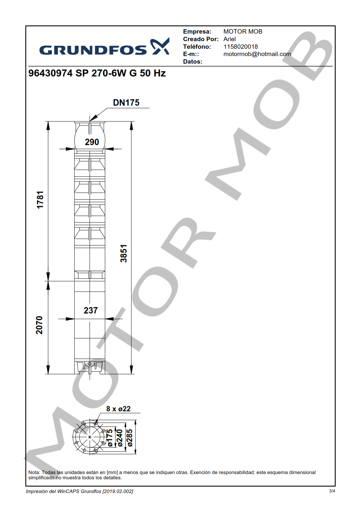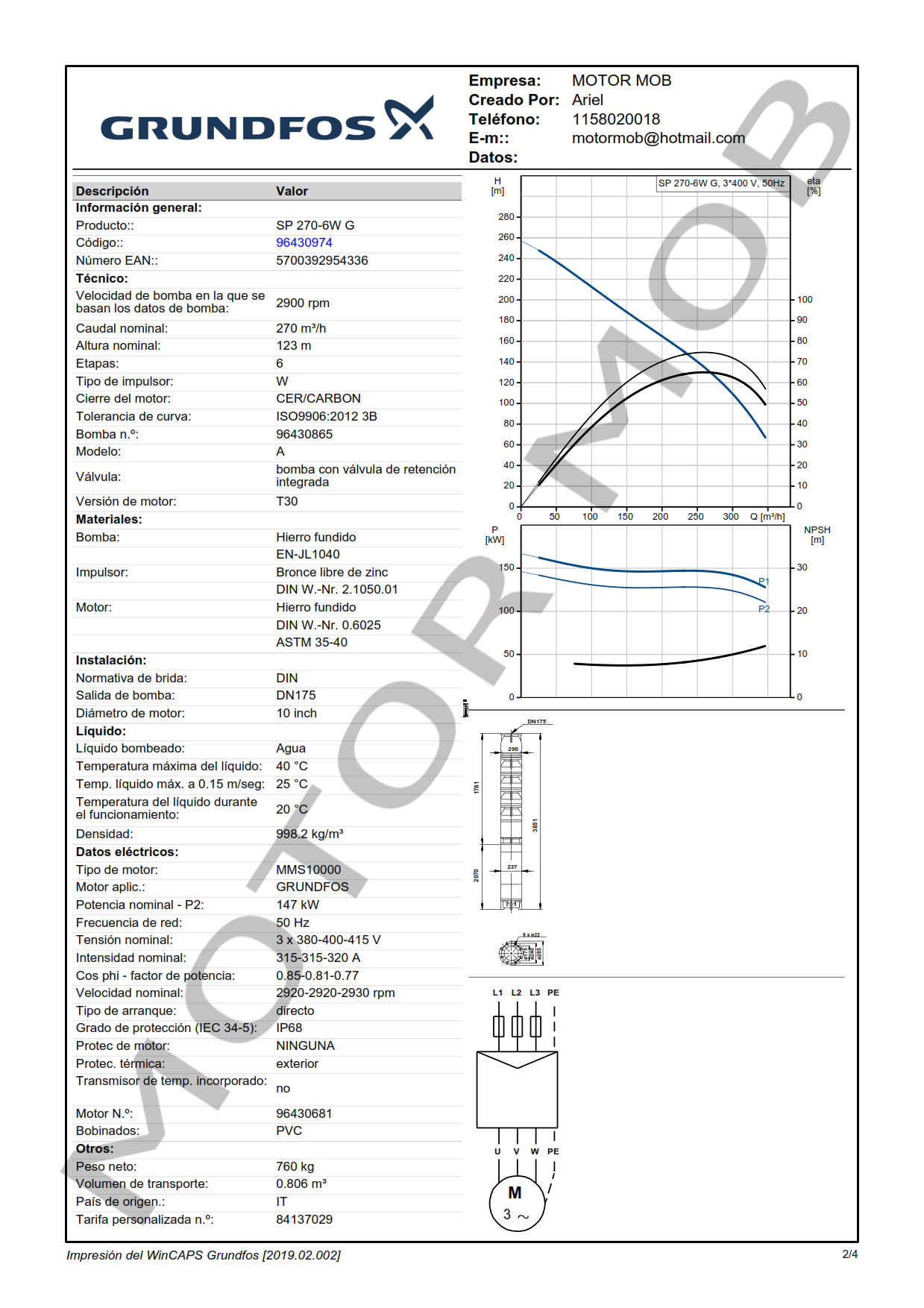 BOMBA SUMERGIBLE PARA POZO DE 10″ – GRUNDFOS – SP 270-6W G – 200 HP – TRIFASICA – ARTICULO 96430974