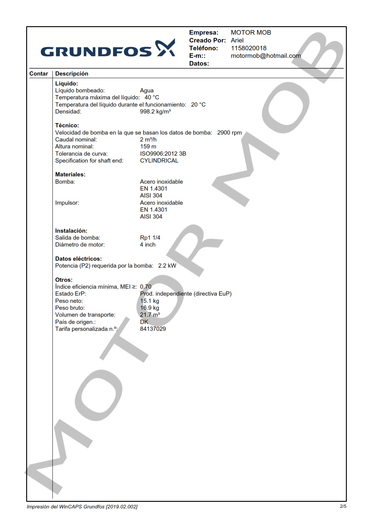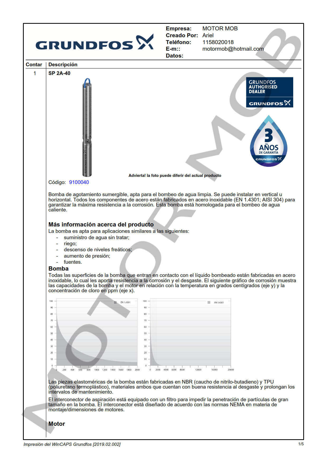 BOMBA SUMERGIBLE PARA POZO DE 4″ – GRUNDFOS – SP 2A-40 – 3 HP – ARTICULO 9100040