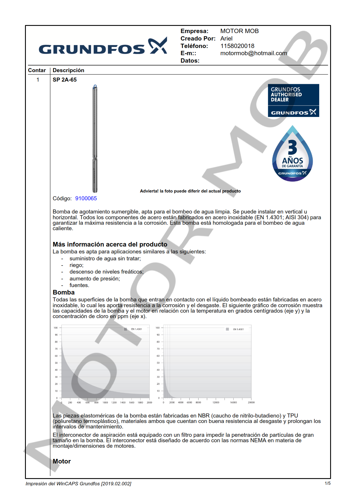 BOMBA SUMERGIBLE PARA POZO DE 4″ – GRUNDFOS – SP 2A-65 – 4 HP – ARTICULO 9100065