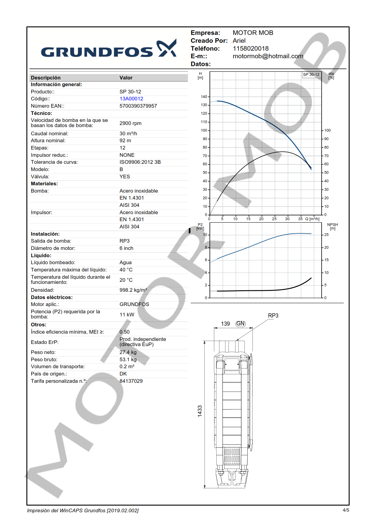 BOMBA SUMERGIBLE PARA POZO DE 6″ – GRUNDFOS – SP 30-12 – 15 HP – ARTICULO 13A00012