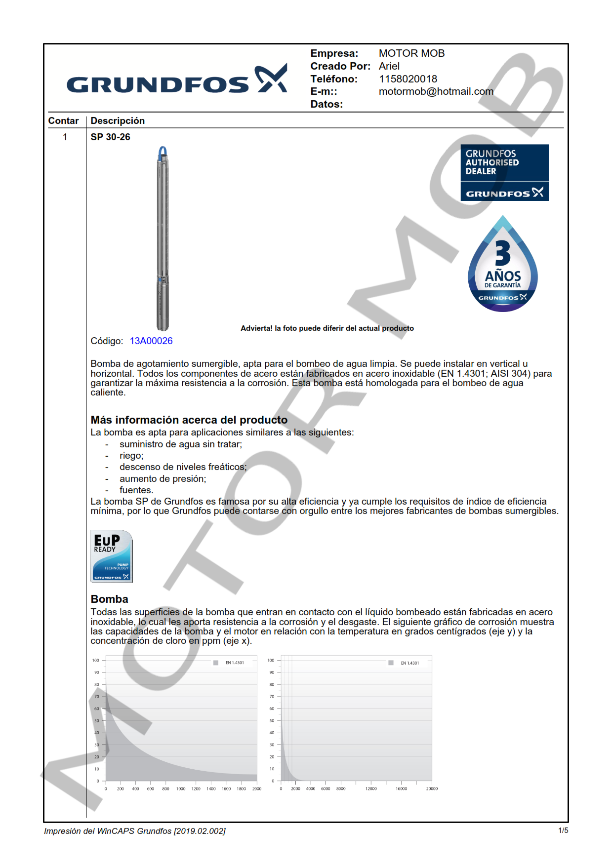 BOMBA SUMERGIBLE PARA POZO DE 6″ – GRUNDFOS – SP 30-26 – 30 HP – ARTICULO 13A00026