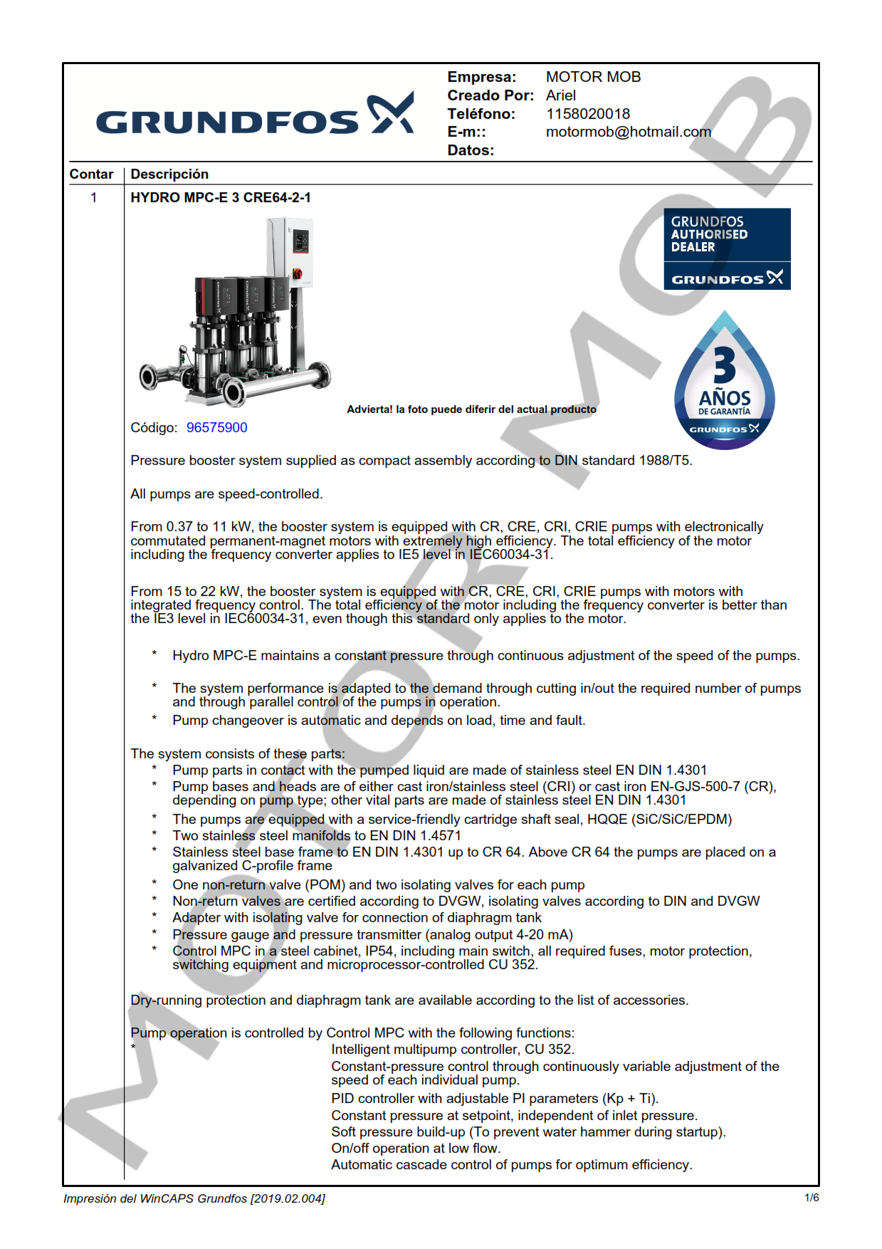 EQUIPO DE PRESURIZACIÓN VARIABLE DE 3 BOMBAS – GRUNDFOS – HYDRO MPC-E CRE 64-2-1 – 18.5 KW – TRIFASICO – ARTICULO 96575900