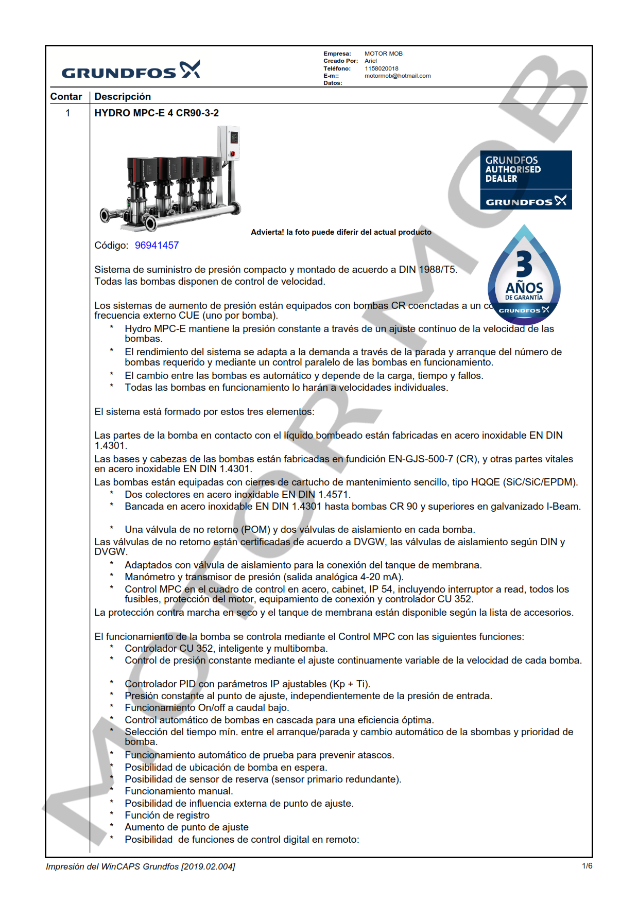 EQUIPO DE PRESURIZACIÓN VARIABLE DE 4 BOMBAS – GRUNDFOS – HYDRO MPC-E CR 90-3-2 – 37 KW – TRIFASICO – ARTICULO 96941457
