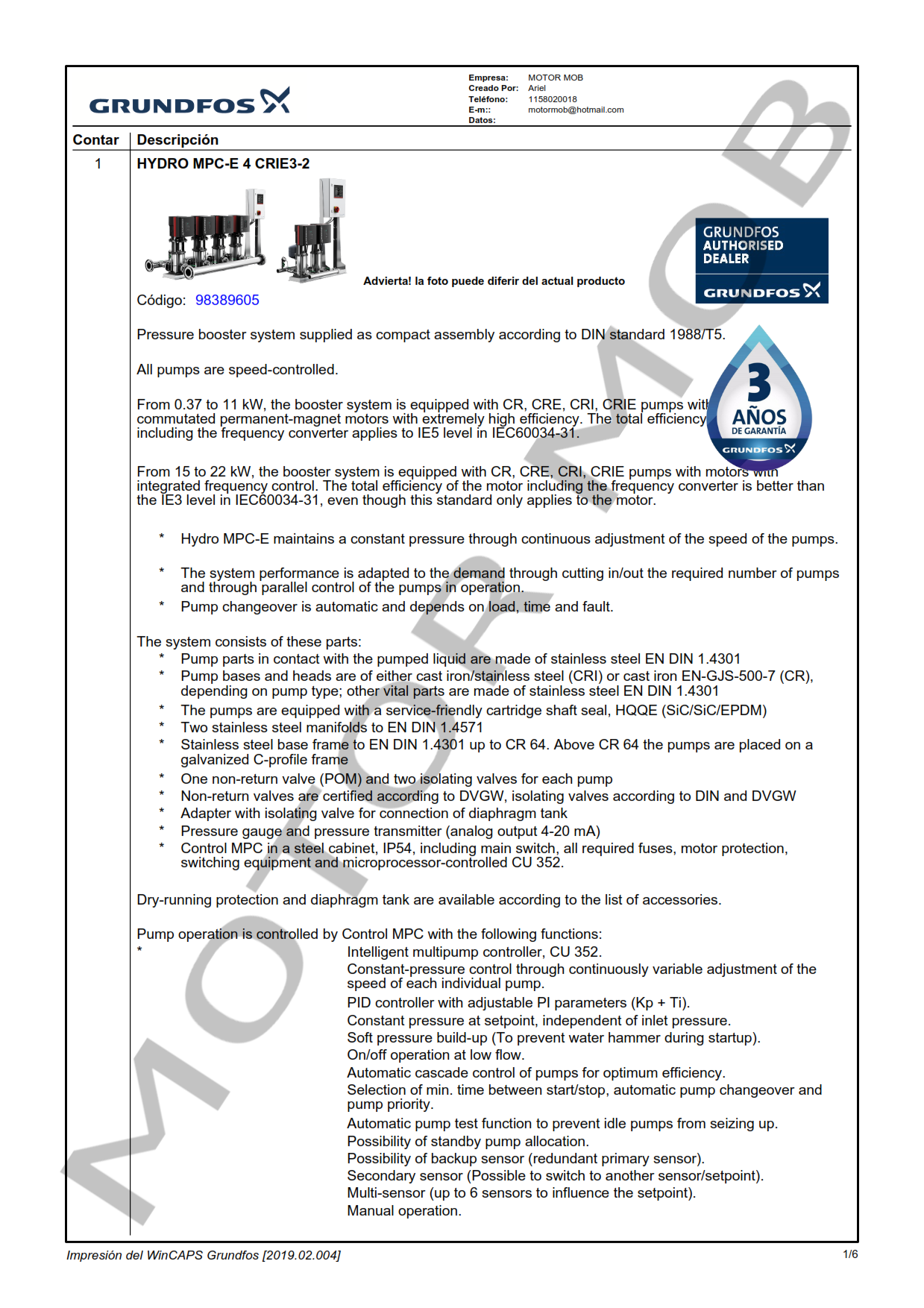 EQUIPO DE PRESURIZACIÓN VARIABLE DE 4 BOMBAS – GRUNDFOS – HYDRO MPC-E CRE 3-2 – 0.37 KW – TRIFASICO – ARTICULO 98389605