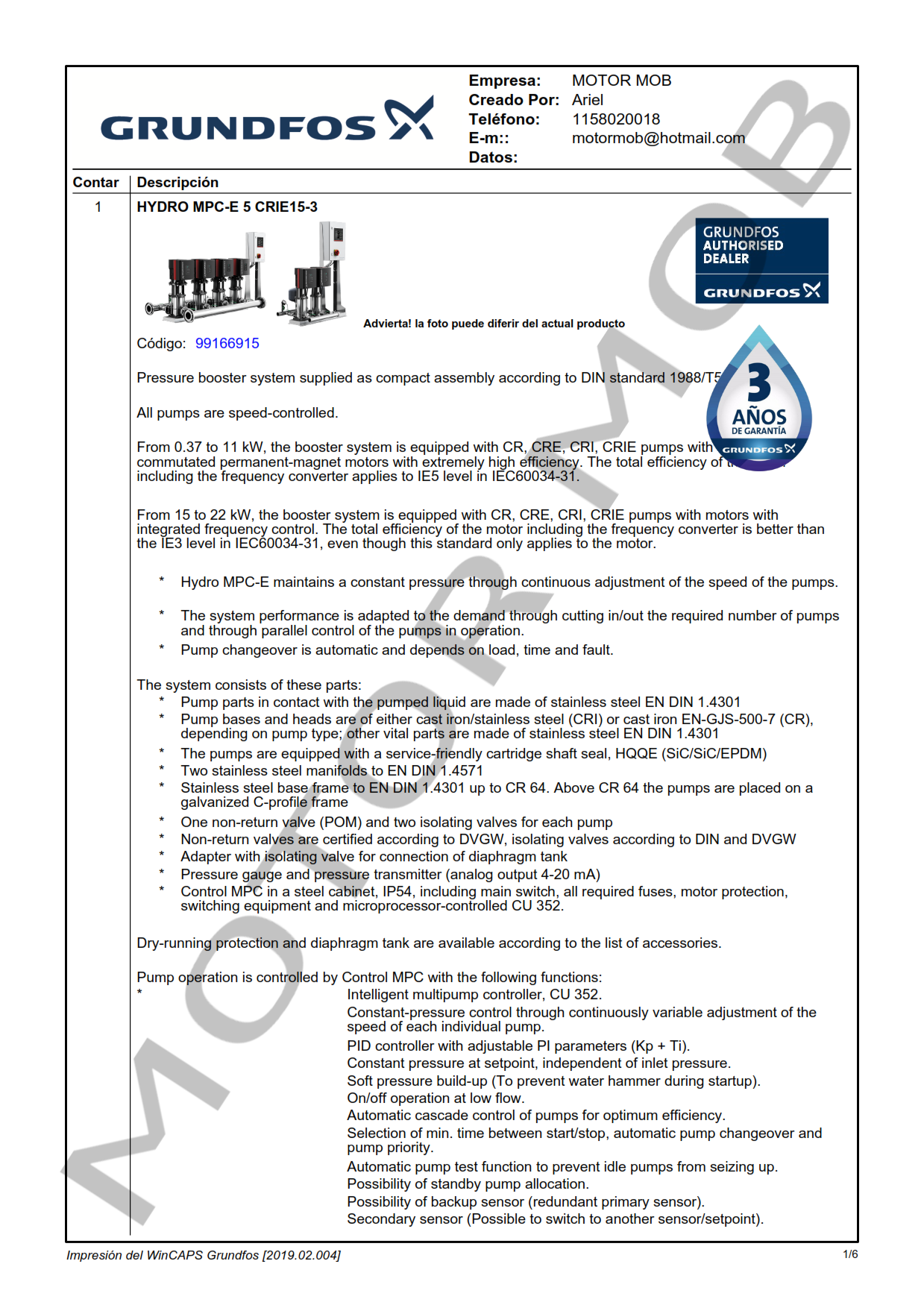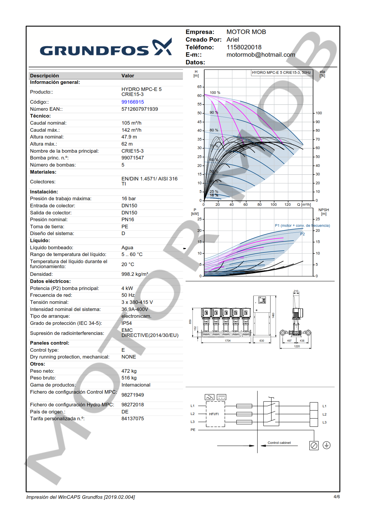 EQUIPO DE PRESURIZACIÓN VARIABLE DE 6 BOMBAS – GRUNDFOS – HYDRO MPC-E CRIE 15-3 – 4 KW – TRIFASICO – ARTICULO 99166915