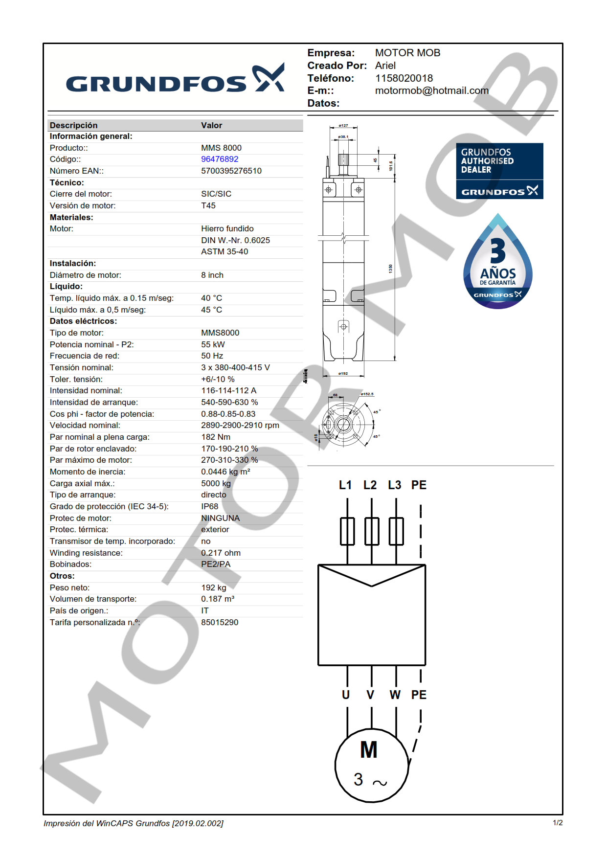 MOTOR SUMERGIBLE REBOBINABLE DE 8″ – GRUNDFOS – MMS 8000 – 75 HP – TRIFASICO – ARTICULO 96476892